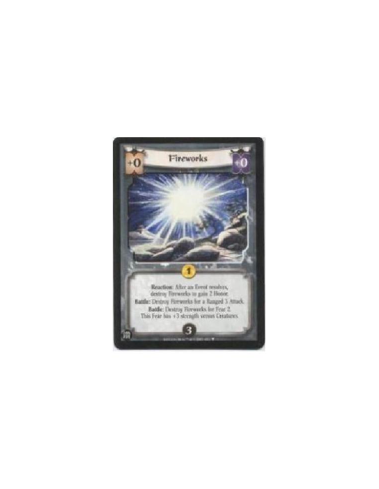 Reaction: After an Event resolves, destroy Fireworks to gain 2 Honor.Battle: Destroy Fireworks for a Ranged 3 Attack.Battle: Destroy Fireworks for Fear 2. This Fear has +3 strength versus Creatures.