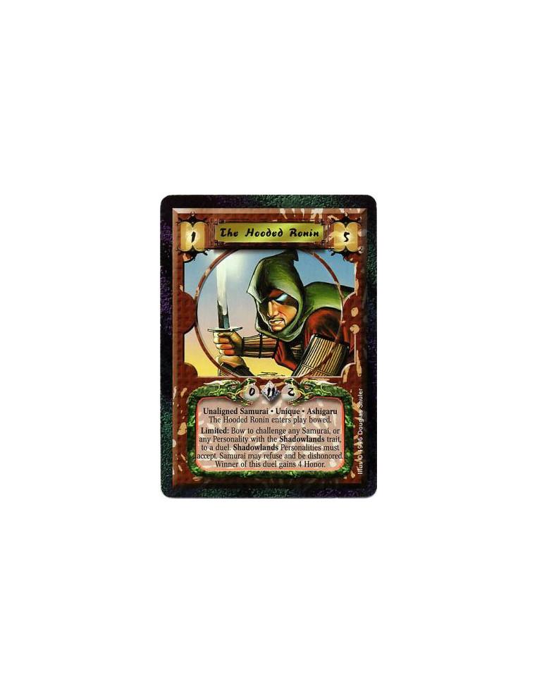 After The Hooded Ronin enters play: Bow him. Limited: Any number of times per turn, bow The Hooded Ronin and target a Samurai or Shadowlands Personality: The Hooded Ronin challenges the target. A Shadowlands target may not refuse, but a non-Shadowlands Samurai may. If he did, dishonor him. The winner's controller gains 4 Honor. Destroy the duel's loser.