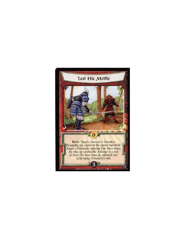 Battle: Target a Samurai or Berserker Personality you control at the current battlefield: Target a Personality opposing him. Yours issues the other an unrefusable challenge to a duel of Force. The loser bows an unbowed card in his losing Personality's unit