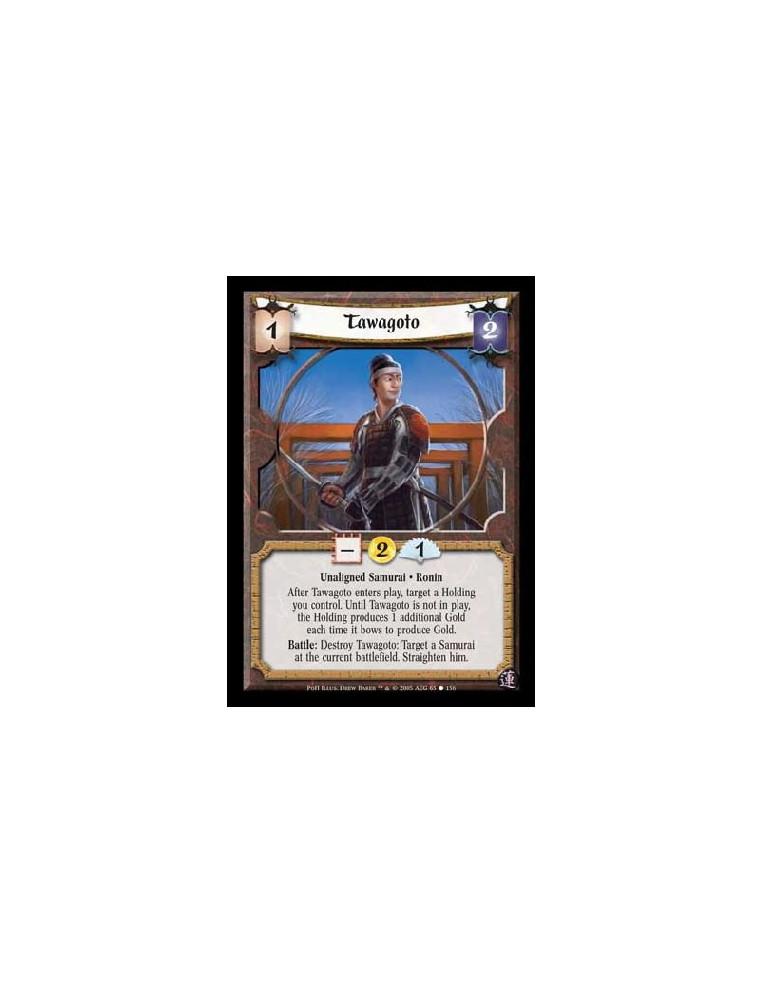 Unaligned Samurai · Ronin. After Tawagoto enters play, target a Holding you control. Until Tawagoto is not in play, the Holding produces 1 additional Gold each time it bows to produce Gold. Battle: Destroy Tawagoto: Target a Samurai at the current battlefield. Straighten him.