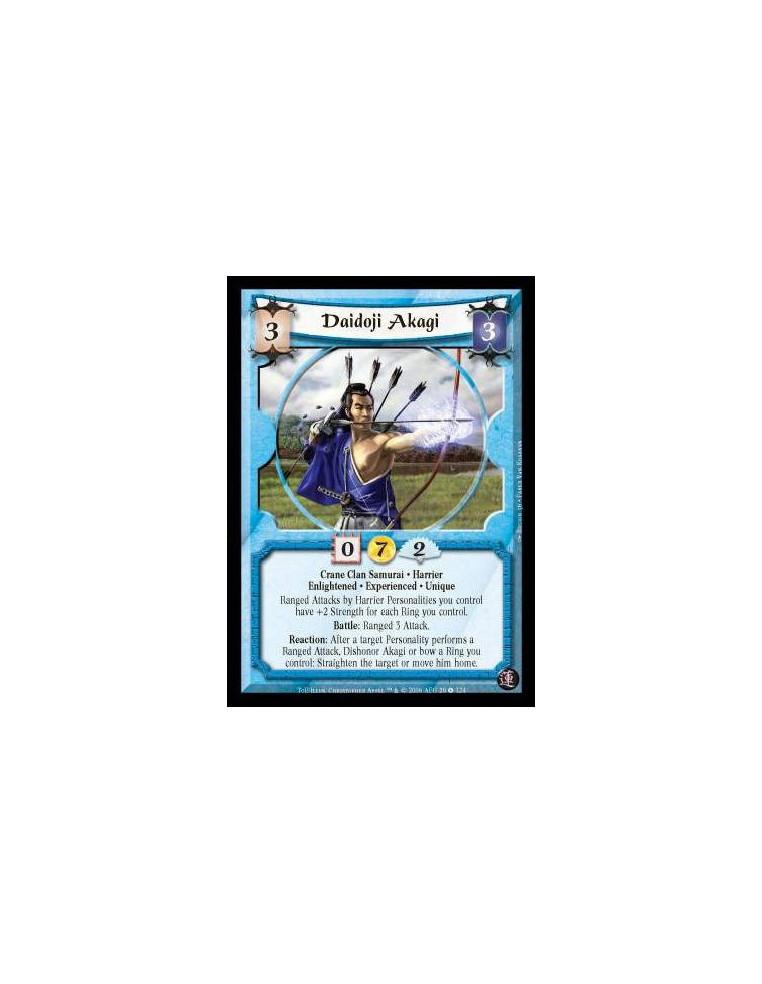 Crane Clan Samurai · Harrier · Enlightened · Experienced · Unique. Ranged Attacks by Harrier Personalities you control have +2 Strength for each Ring you control. Battle: Ranged 3 Attack. Reaction: After a target Personality performs a Ranged Attack, Dishonor Akagi or bow a Ring you control: Straighten the target or move him home.