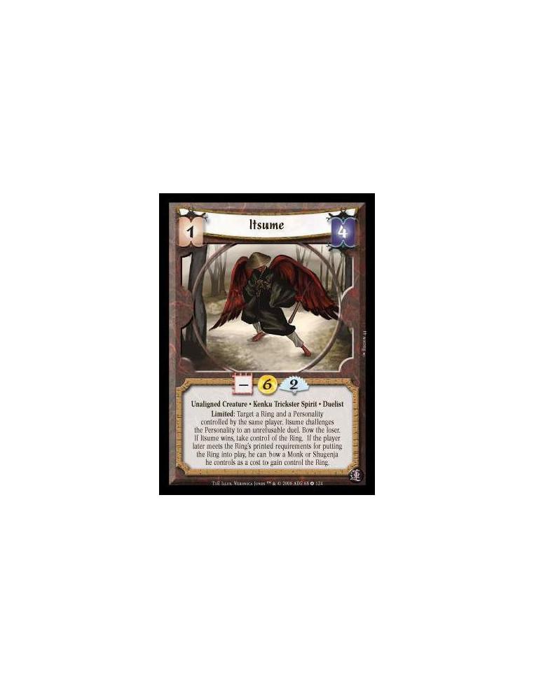 Unaligned Creature · Kenku Trickster Spirit · Duelist. Limited: Target a Ring and a Personality controlled by the same player. Itsume challenges the Personality to an unrefusable duel. Bow the loser. If Itsume wins, take control of the Ring. If the player later meets the Ring's printed requirements for putting the Ring into play, he can bow a Monk or Shugenja he controls as a cost to gain control the Ring.
