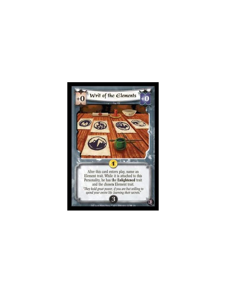 After this card enters play, name an Element trait. While it is attached to this Personality, he has the Enlightened trait and the chosen Element trait.