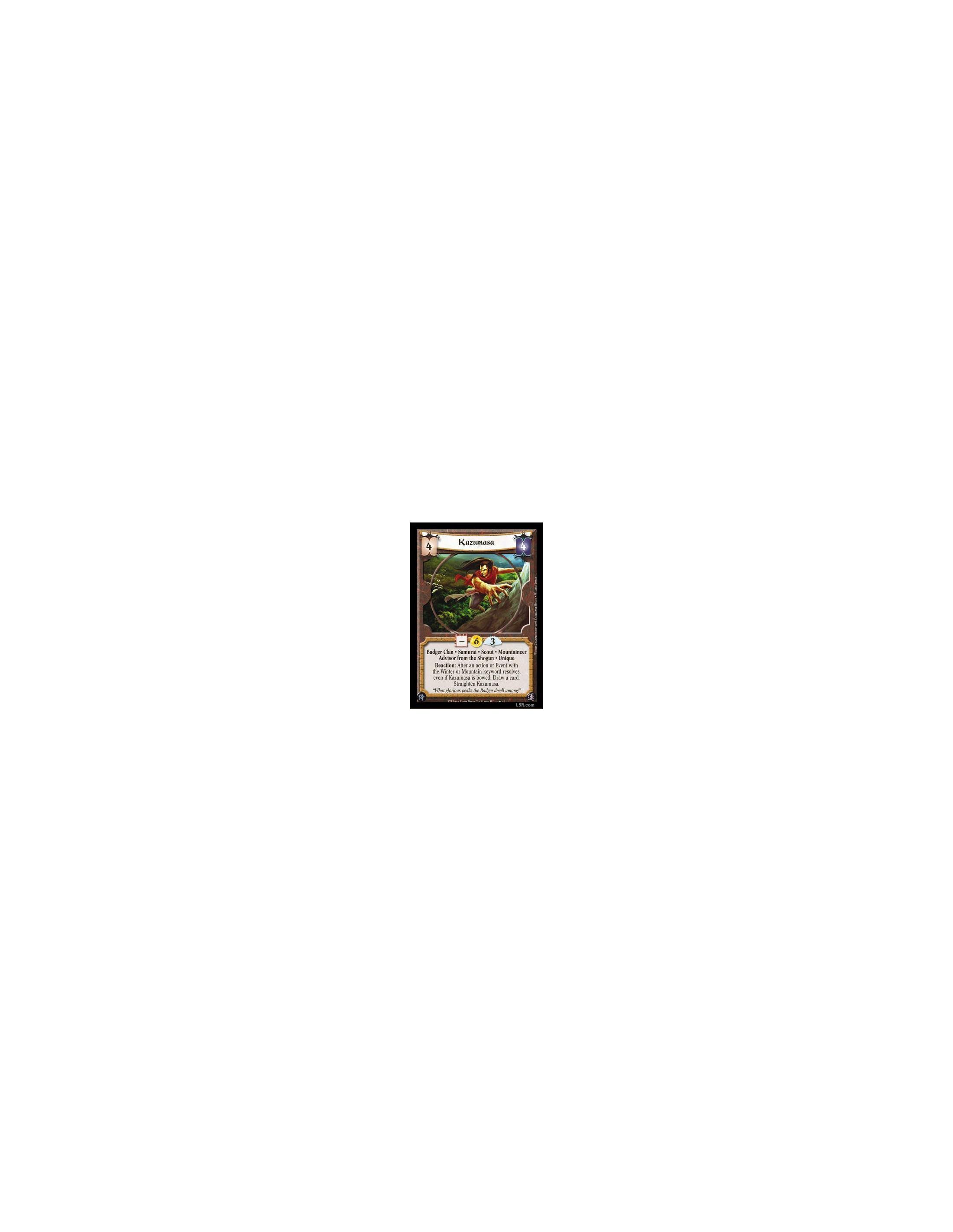 Badger Clan · Samurai · Scout · Mountaineer · Advisor from the Shogun · Unique. Reaction: After an Action or Event with the Winter or Mountain keyword resolves, even if Kazumasa is bowed: Draw a card. Straighten Kazumasa.