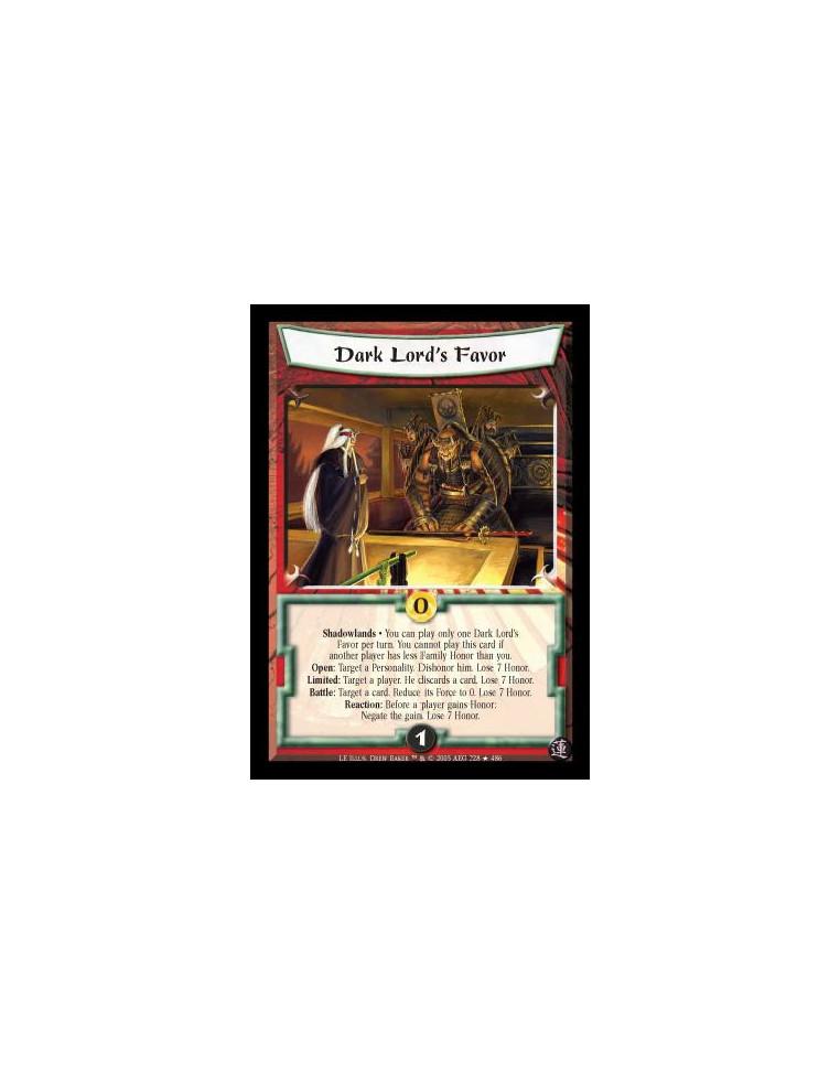 Shadowlands · You can play only one Dark Lord's Favor per turn. You cannot play this card if another player has less Family Honor than you. Open: Target a Personality. Dishonor him. Lose 7 Honor. Limited: Target a player. He discards a card. Lose 7 Honor. Battle: Target a card. Reduce its Force to 0. Lose 7 Honor. Reaction: Before a player gains Honor: Negate the gain. Lose 7 Honor