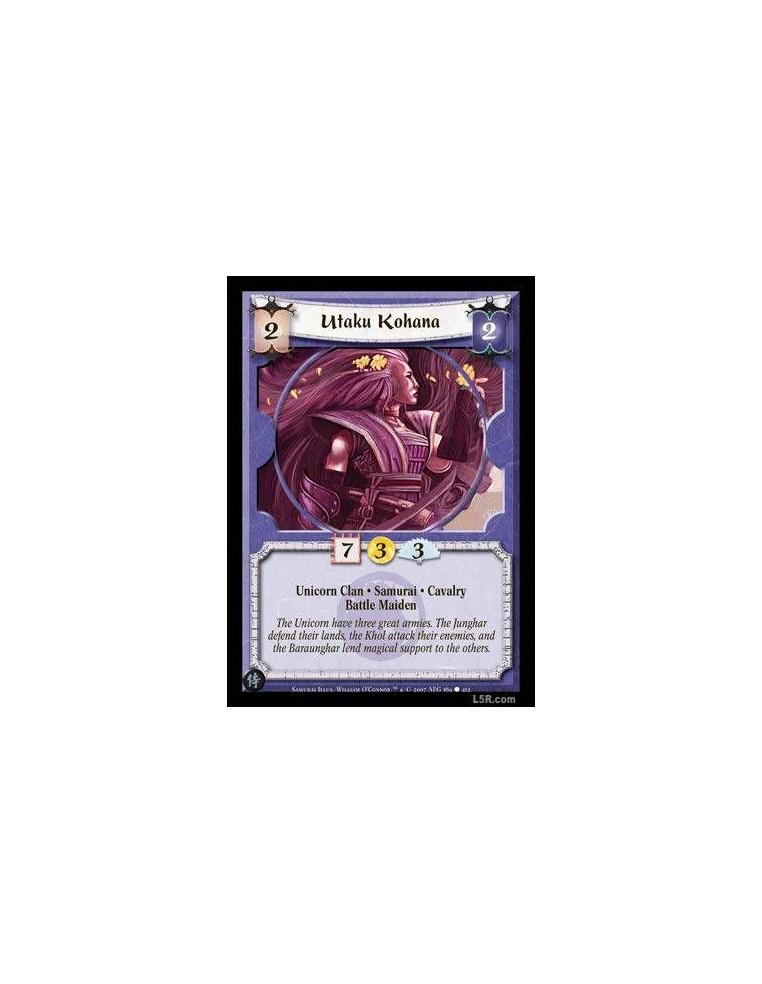Unicorn Clan • Samurai • Cavalry Soonshin has +2F while opposing any units controlled by a player with higher Family Honor than yours. Battle: Destroy a target non-Unique enemy Tactician.