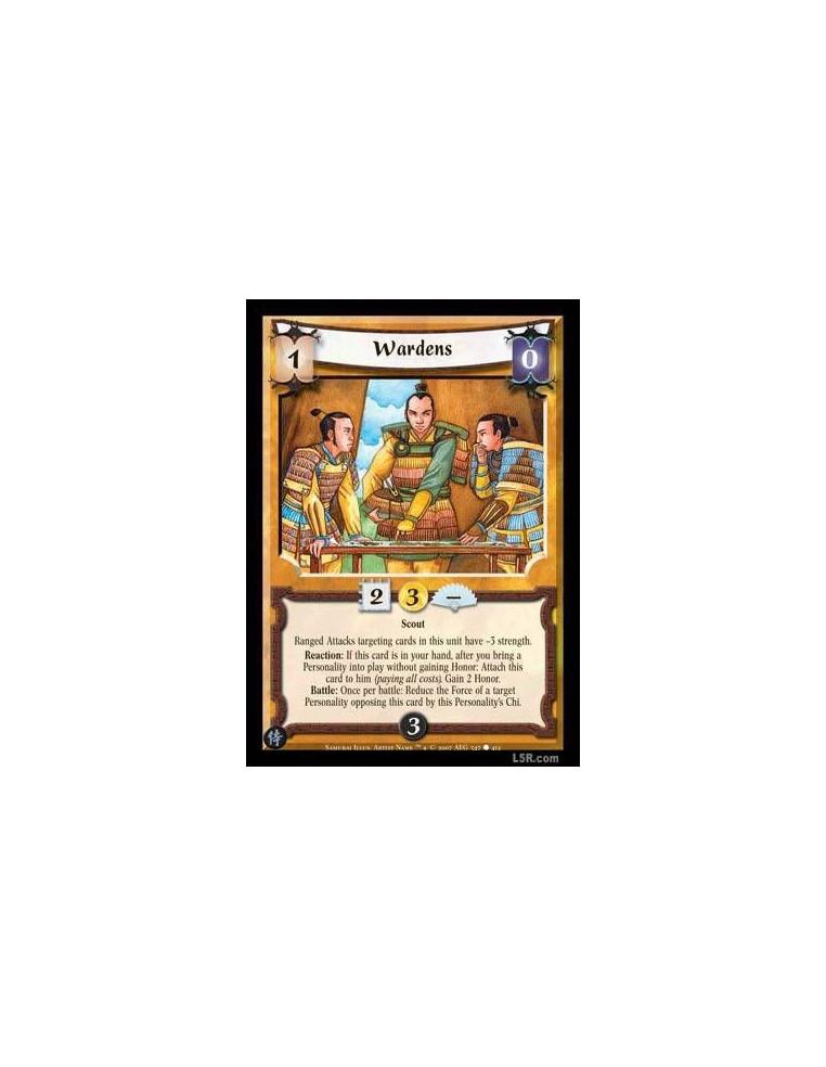 Scout Ranged Attacks targeting cards in this unit have -3 strength. Reaction : If this card is in your hand, after you bring a Personality into play without gaining Honor: Attach this card to him (paying all costs). Gain 2 Honor. Battle : Once per battle: Reduce the Force of a target Personality opposing this card by this Personality's Chi.