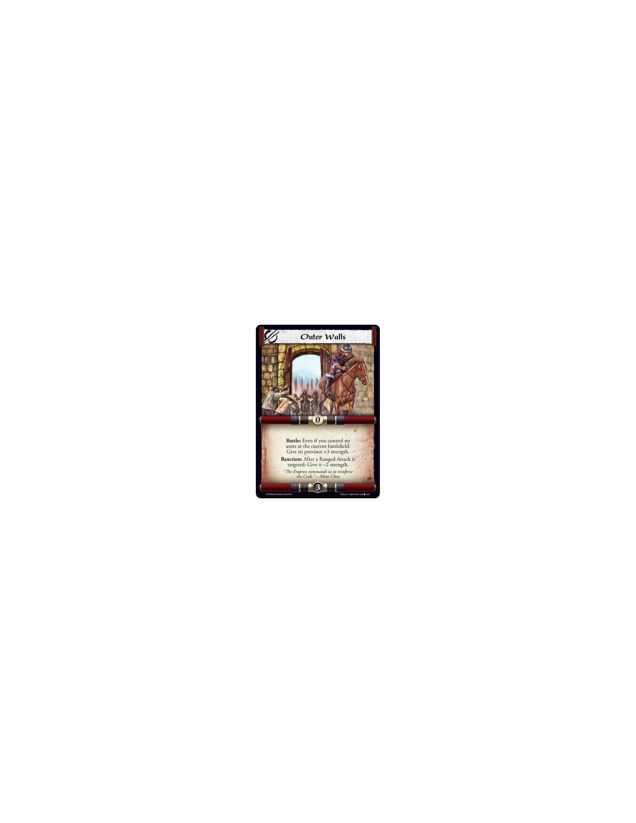 Outer Walls  - Battle: Even if you control no units at the current battlefield: Give its province +3 strength. Reaction: After a
