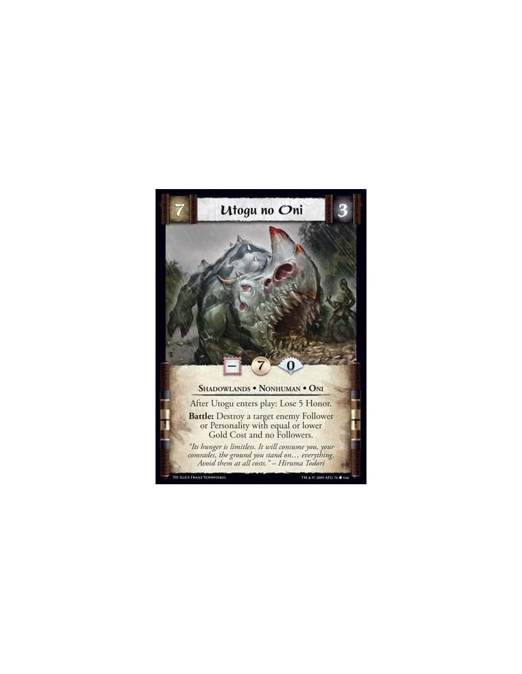 Shadowlands • Nonhuman • Oni After Utogu enters play: Lose 5 Honor. Battle: Destroy a target enemy Follower or Personality with equal or lower Gold Cost and no Followers.