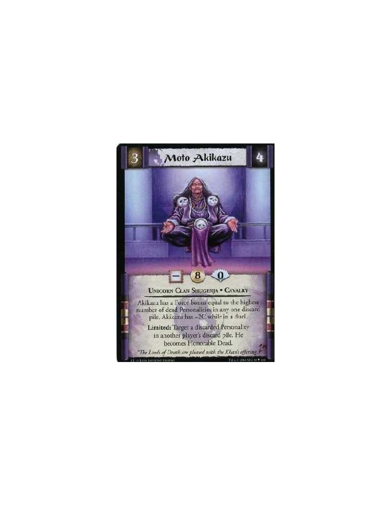 Reaction: After the resolution of a Battle action that destroyed one of your Deathseekers: Bring a target face-up Personality in one of your provinces into play at the current battlefield, paying 3 less Gold. Gain 2 Honor.