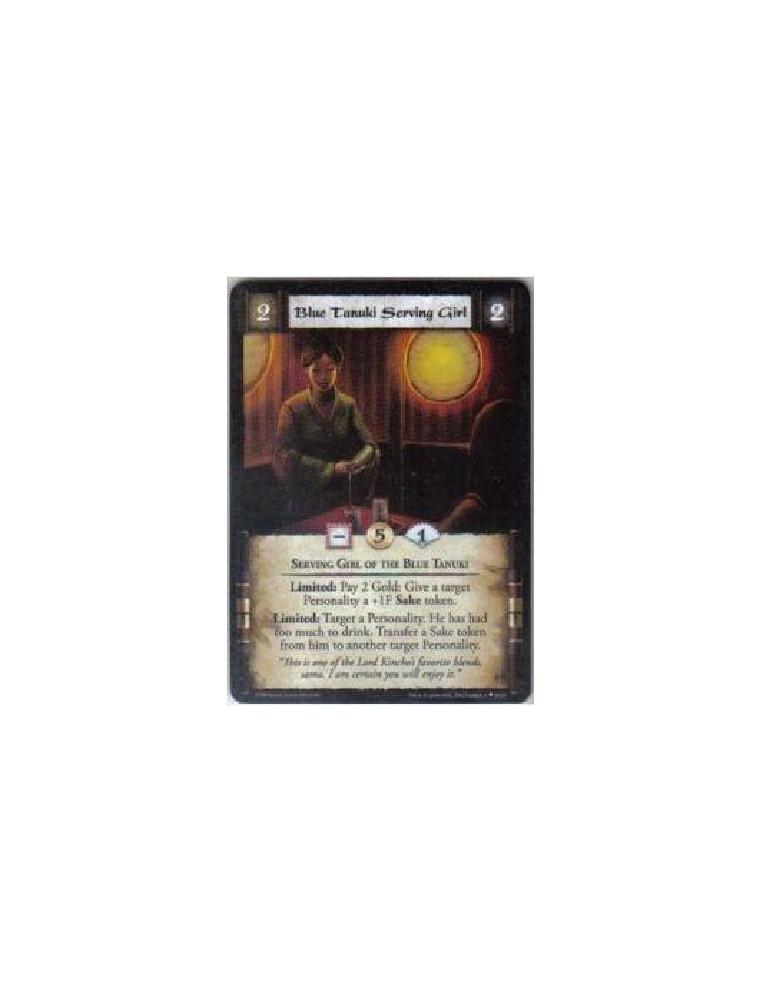 Serving Girl of the Blue Tanuki Limited: Pay 2 Gold: Give a target Personality a +1F Sake token. Limited: Target a Personality. He has had too much to drink. Transfer a Sake token from him to another target Personality.