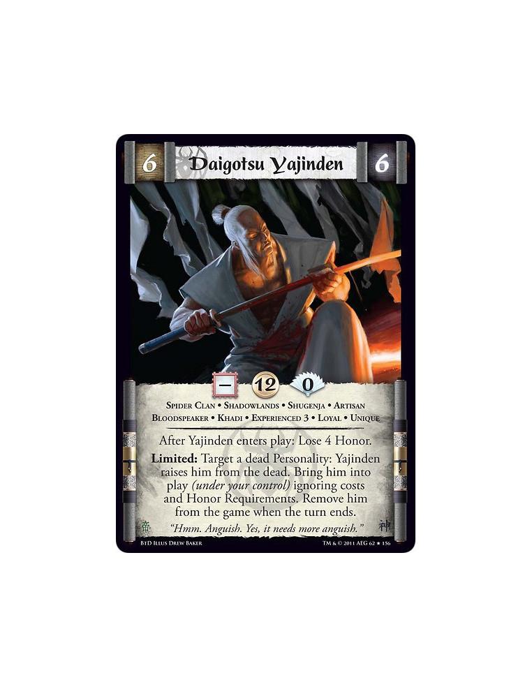 After Yajinden enters play: Lose 4 Honor. Limited: Target a dead Personality: Yajinden raises him from the dead. Bring him into play (under your control) ignoring costs and Honor Requirements. Remove him from the game when the turn ends.