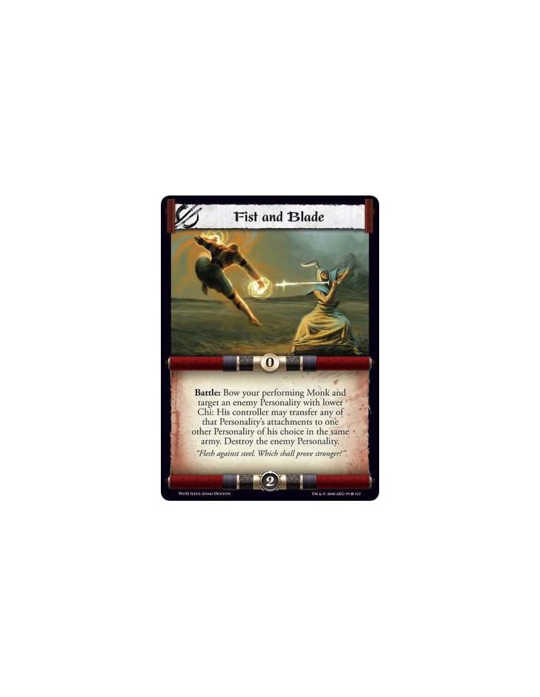 Weapon. Battle: If this unit is at the current battlefield, destroy this card and Dishonor this Personality: Target a Follower, or a Personality without Followers, with a Force less than 5 at any location. Lose 3 Honor. Destroy the target.