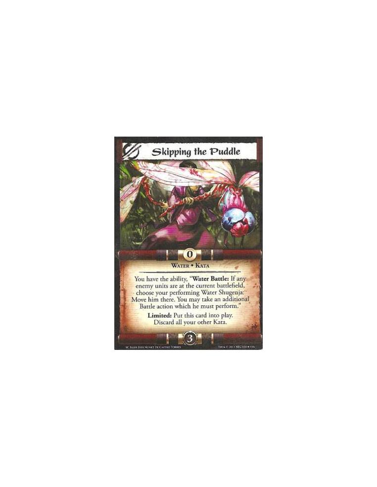 You have the ability, “Water Battle: If any enemy units are at the current battlefield, choose your performing Water Shugenja: Move him there. You may take an additional Battle action which he must perform.” Limited: Put this card into play. Discard all your other Kata.