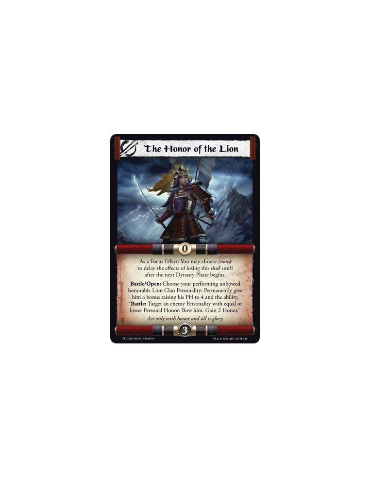 As a Focus Effect: You may choose (now) to delay the effects of losing this duel until after the next Dynasty Phase begins. Battle/Open: Choose your performing unbowed honorable Lion Clan Personality: Permanently give him a bonus raising his PH to 4 and the ability, “Battle: Target an enemy Personality with equal or lower Personal Honor: Bow him. Gain 2 Honor.”