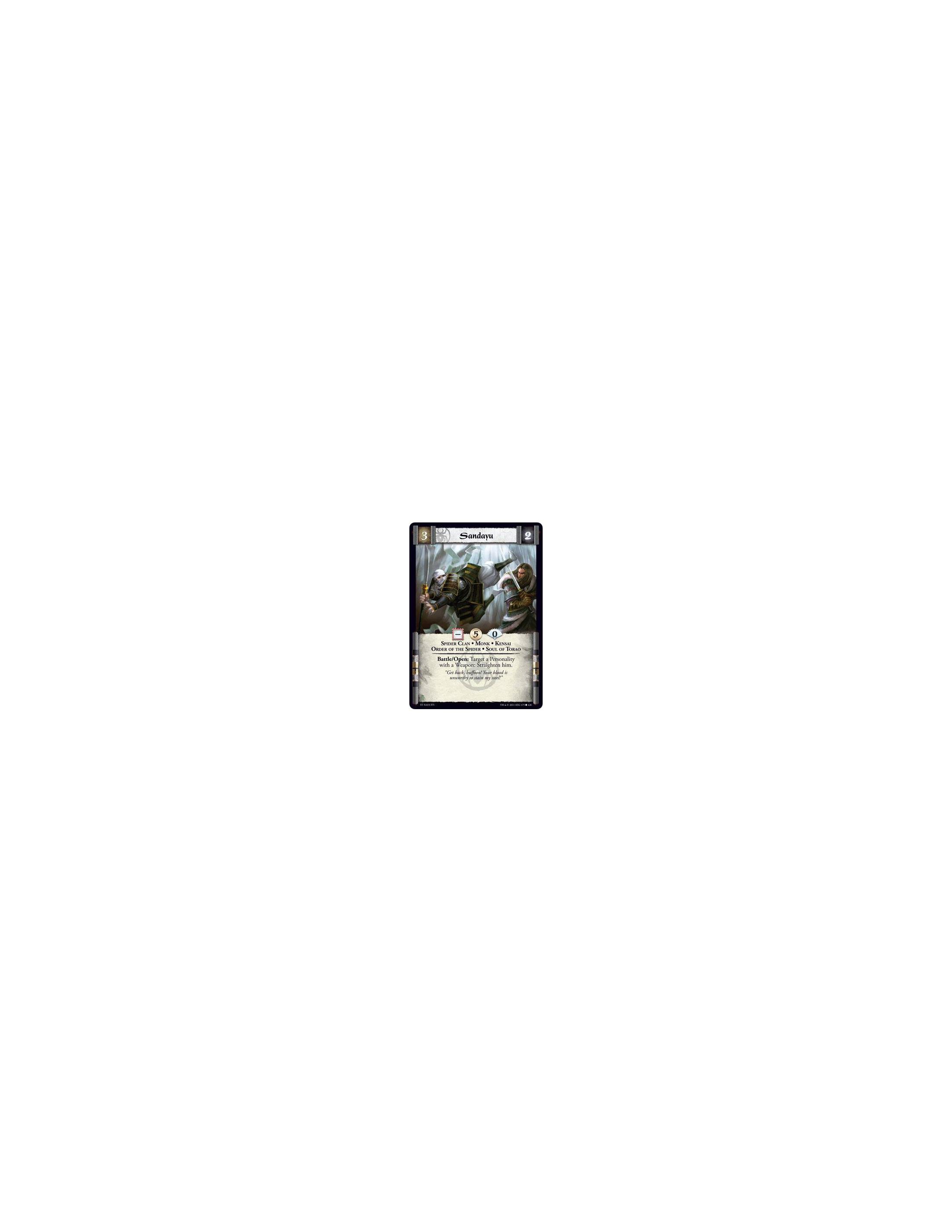 Phoenix Clan • Fire • Samurai • Duelist • Legion of Flame • YojimboIaijutsu Battle: Target an enemy Personality: Kudome duels him. Bow the duel’s loser. Give Kudome a +1F Fire token if she won and you control a Shugenja.