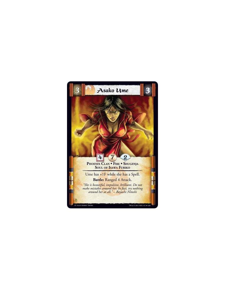 Asako Ume  - Phoenix Clan • Fire • Shugenja • Soul of Isawa FurikoUme has +1F while she has a Spell. Battle: Ranged 4 Attack.