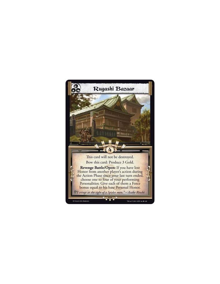 This card will not be destroyed. Bow this card: Produce 3 Gold. Revenge Battle/Open: If you have lost Honor from another player’s action during the Action Phase since your last turn ended, choose one to four of your performing Personalities: Give them each a Force bonus equal to their base Personal Honor.
