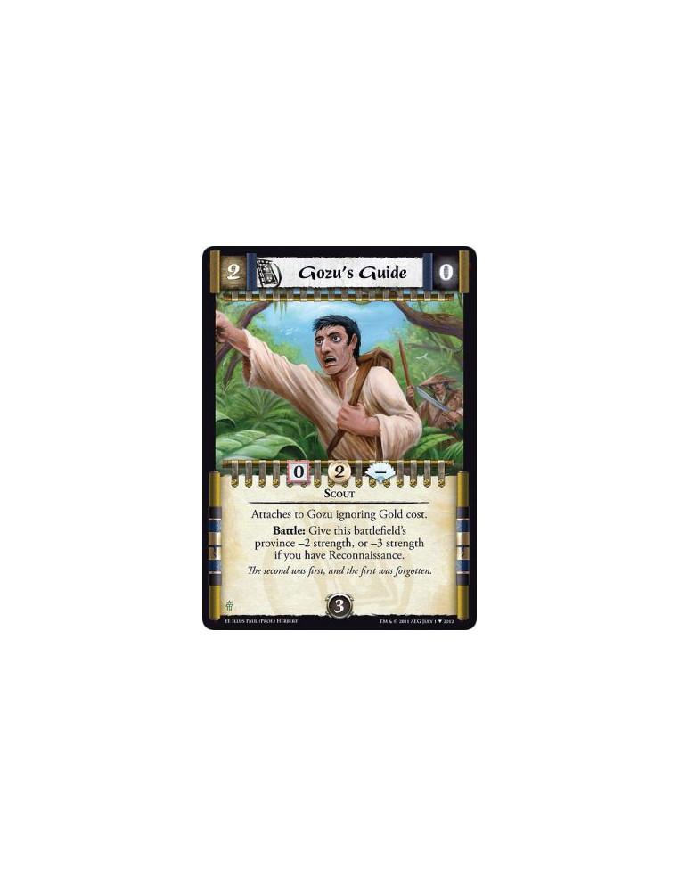 Gozu's Guide  - ScoutAttaches to Gozu ignoring Gold cost.  Battle: Give this battlefield's province -2 strength, or -3 strength