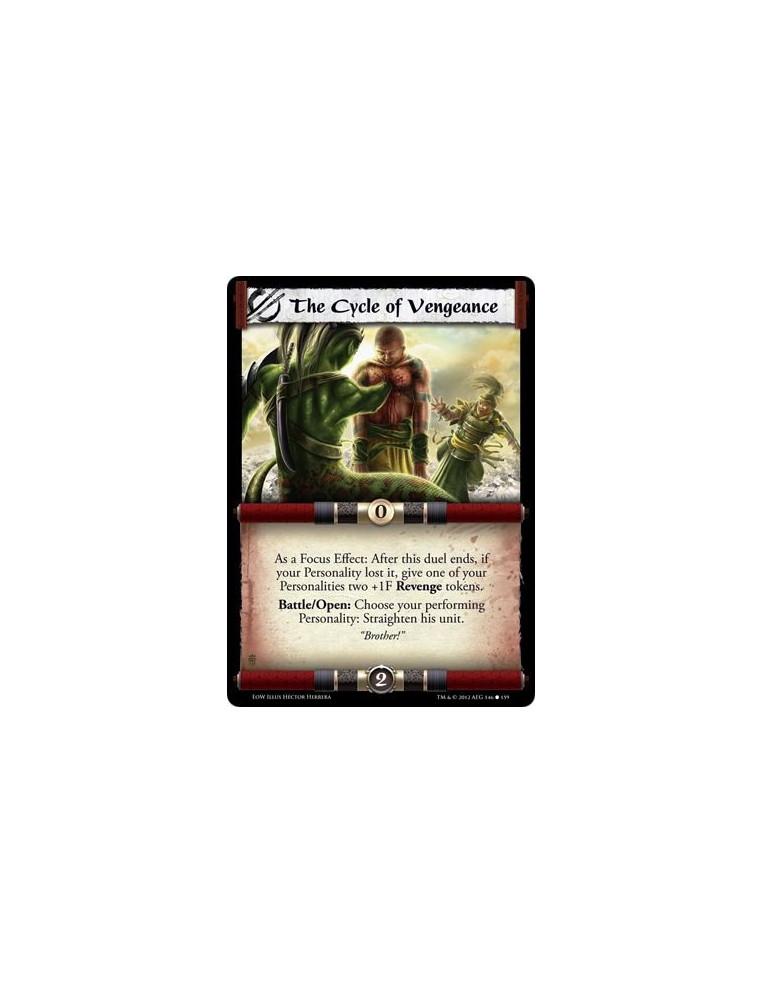 As a Focues Effect: After this del ends, if your Personality lost it, give one of your Personalities two +1F Revenge tokens. Battle/Open: Choose your performing Personality: Straighten his unit.