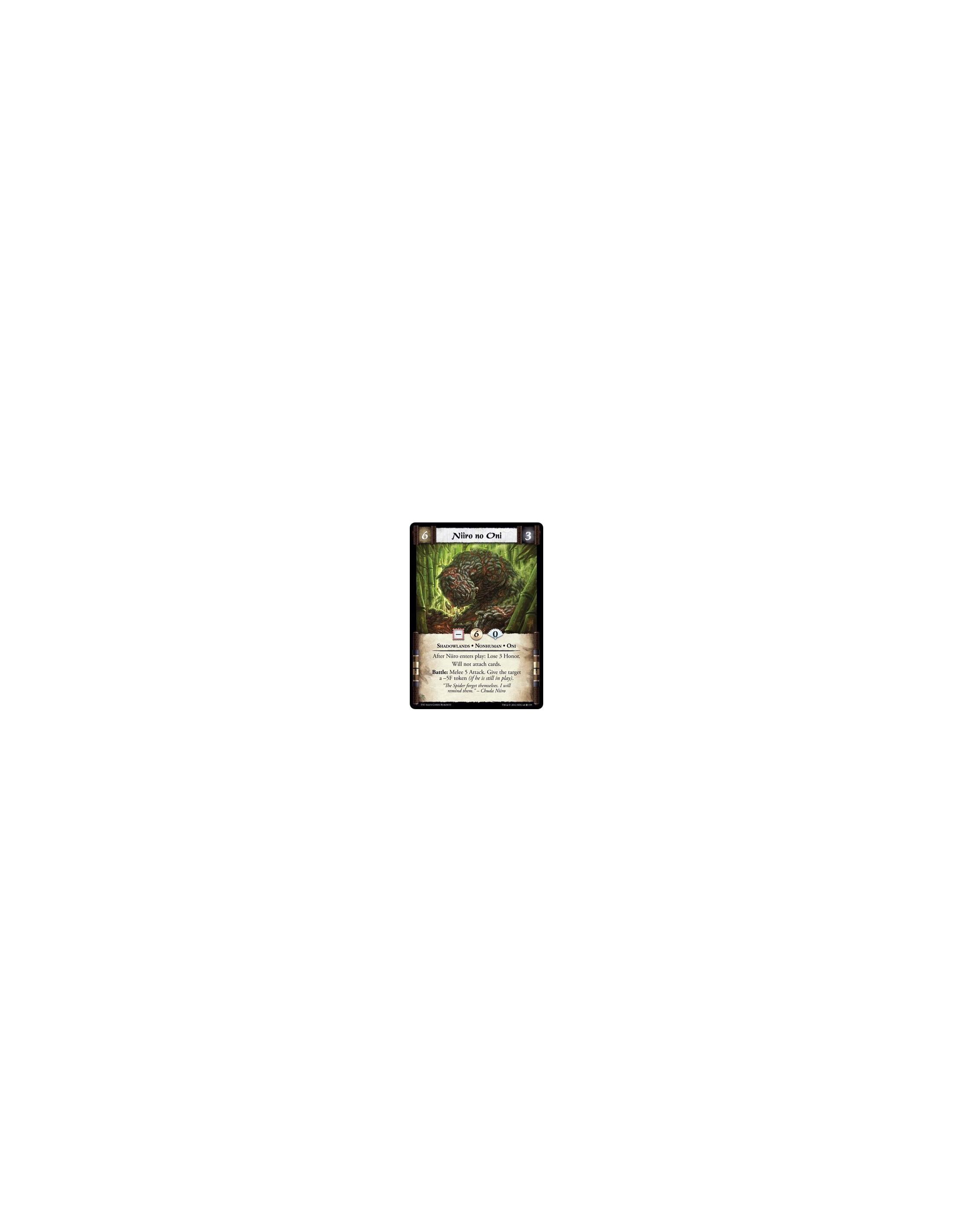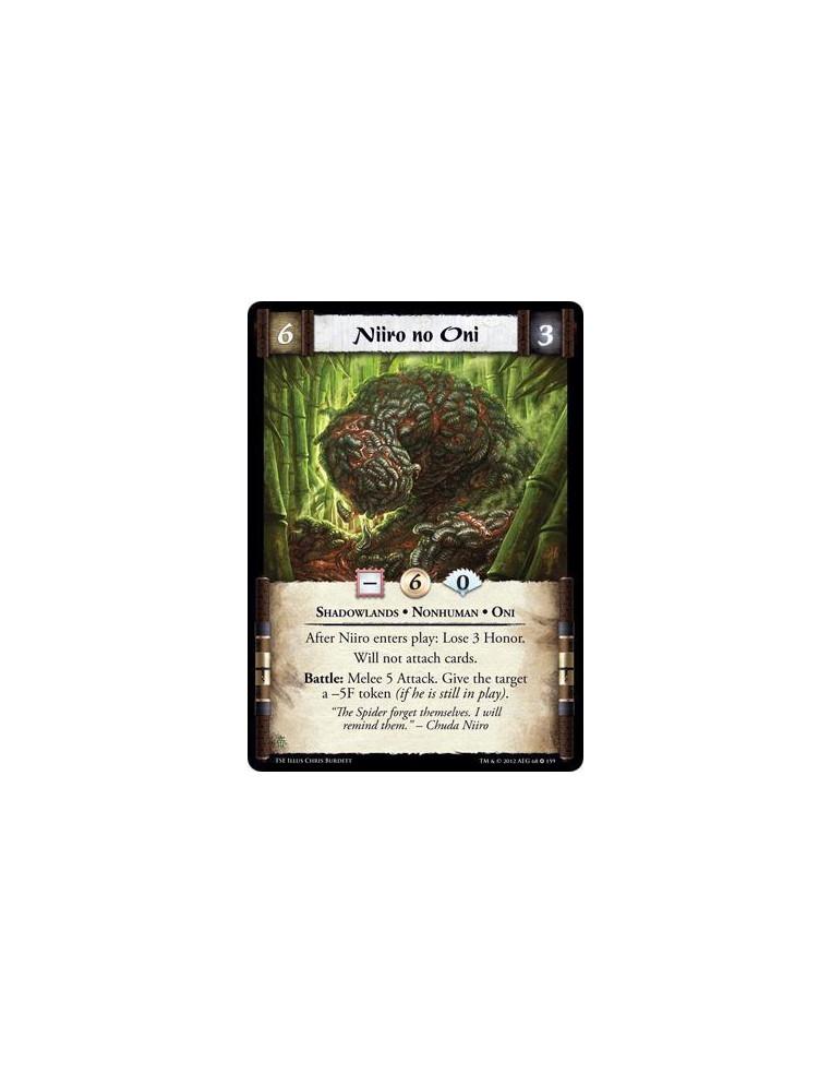 Niiro no Oni  - Shadowlands • Nonhuman • OniAfter Niiro enters play: Lose 3 Honor. Will not attach cards. Battle: Melee 5 Attack