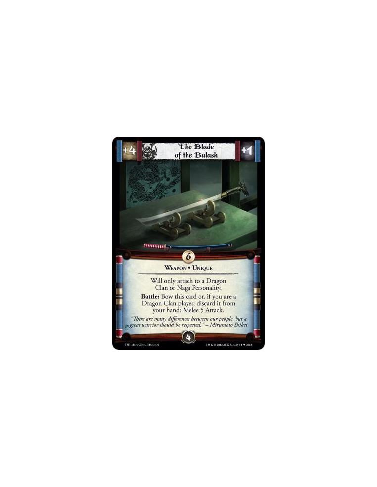 The Blade of the Balash  - Weapon • UniqueWill only attach to a Dragon Clan or Naga Personality.  Battle: Bow this card or, if y