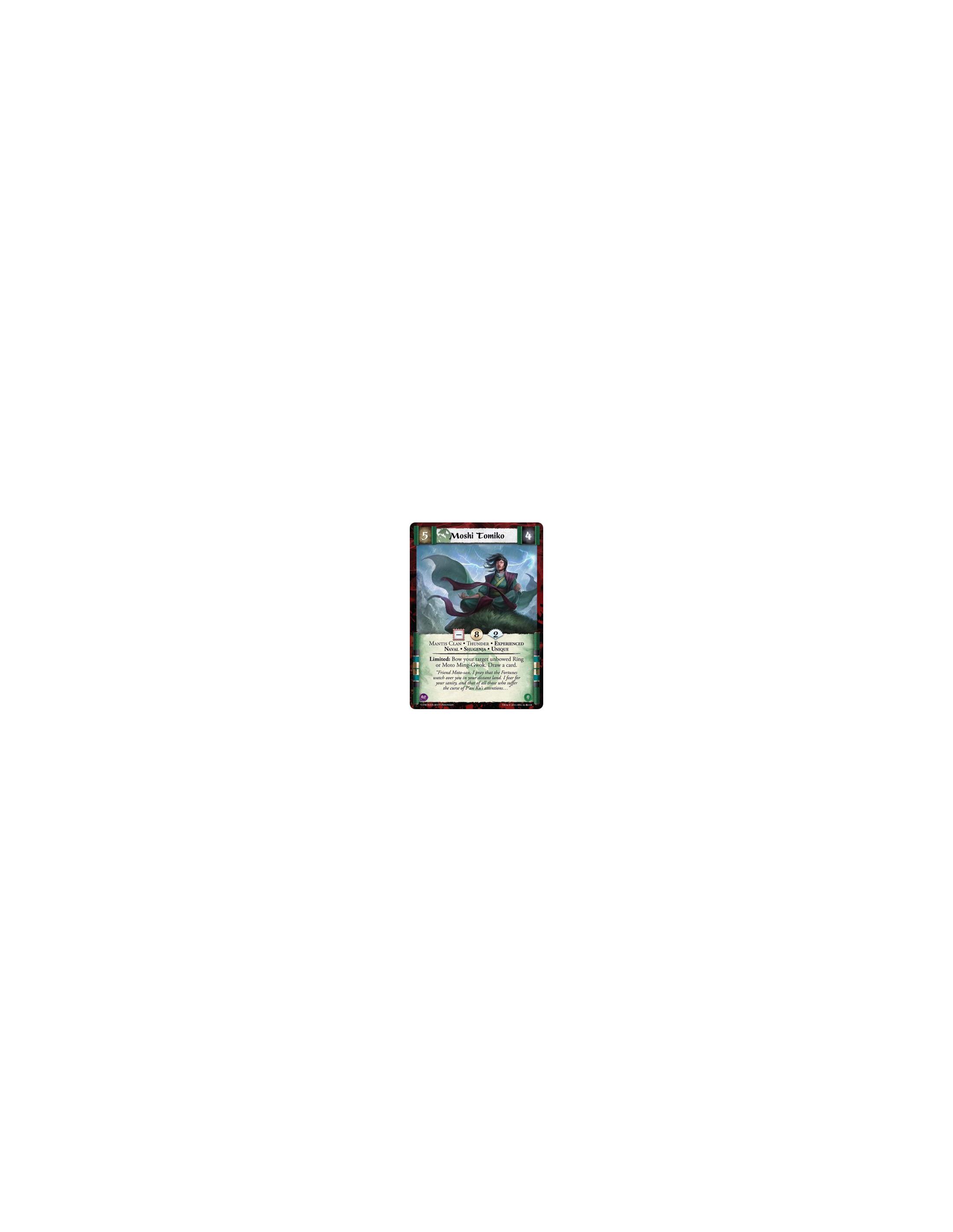 Moshi Tomiko Exp  - Experienced • Mantis Clan • Naval • Shugenja • Thunder • UniqueLimited: Bow your target unbowed Ring or Moto
