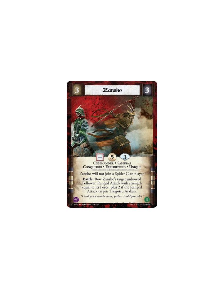 Crane Clan Samurai · Harrier Liaison. Your actions satisfy the Rule of Presence if Ran was at the current battlefield at any time this attack. Battle: Once per battle, target a card in the enemy leader's army. Move Ran to the current battlefield. Straighten her. Give the target ?3F.