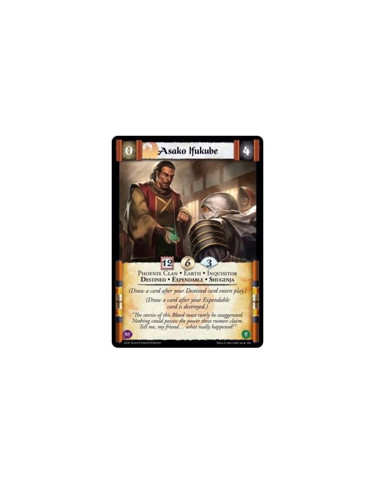 Dragon Clan • Samurai • Kensai. After Otohigo enters play: You may create a +2F Weapon Item card and attach it to him. Battle: Bow one of Otohiko’s Weapons: Give a target enemy Personality or Follower -3F