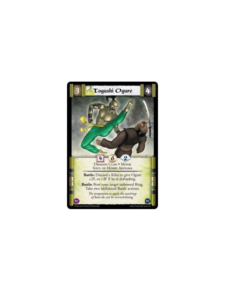 Togashi Ogure  - Dragon Clan • Monk • Soul of Hoshi AkiyamaBattle: Discard a Kiho to give Ogure +2F, or +3F if he is defending.