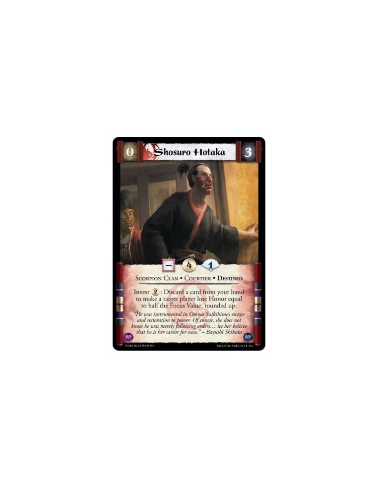 Shosuro Hotaka  - Courtier • Destined • Scorpion ClanInvest 2: Discard a card from your hand to make a target player lose Honor