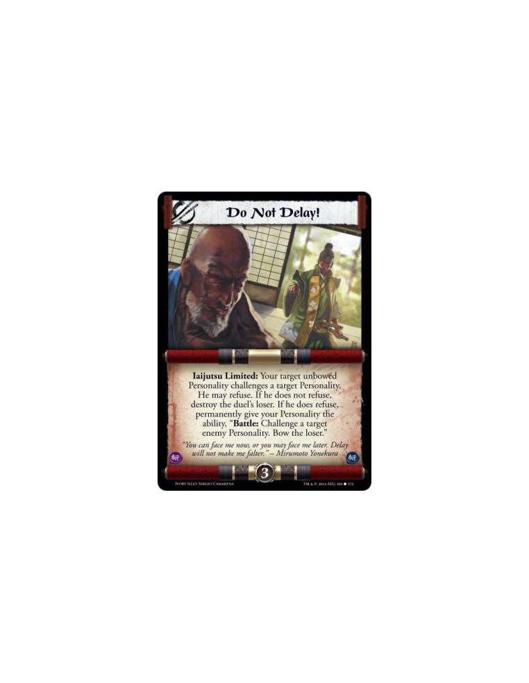 Iaijutsu Limited: Your target unbowed Personality challenges a target Personality. He may refuse. If he does not refuse, destroy the duel's loser. If he does refuse, permanently give your Personality the ability, "Battle: Challenge a target enemy Personality