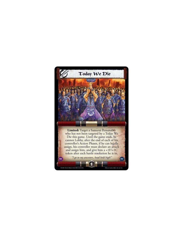 Limited: Target a Samurai Personality who has not been targeted by a Today We Die this game. Until the game ends, he cannot Lobby, after the end of each of his controller's Action Phases, if he can legally assign, his controller must declare an attack and assign him, and give him a +1F/+1C token after each battle resolution he is in.