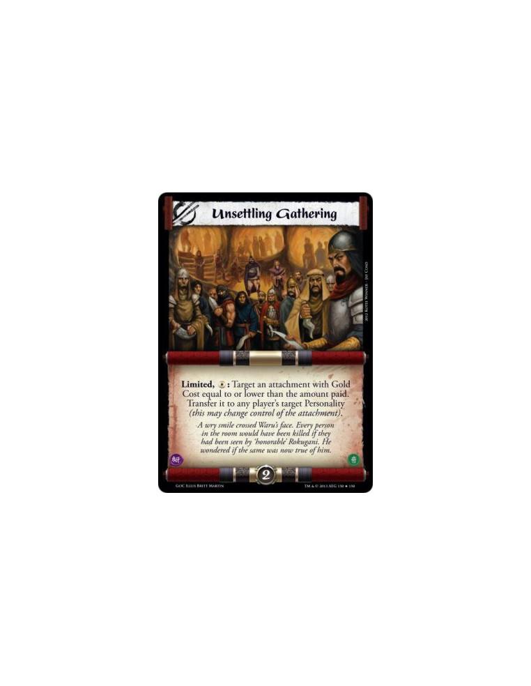 Unsettling Gathering  - Limited, *: Target an attachment with Gold Cost equal to or lower than the amount paid. Transfer it to a
