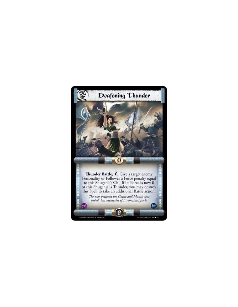 Thunder Battle, w: Give a target enemy Personality or Follower a Force penalty equal to this Shugenja's Chi. If its Force is now 0 or this Shugenja is Thunder, you may destroy this Spell to take an additional Battle action.