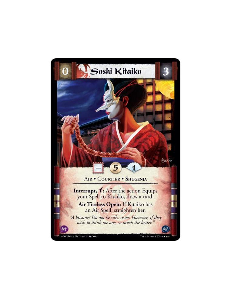 Soshi Kitaiko  - Air • Courtier • ShugenjaInterrupt, w: After the action Equips your Spell to Kitaiko, draw a card. Air Tireless