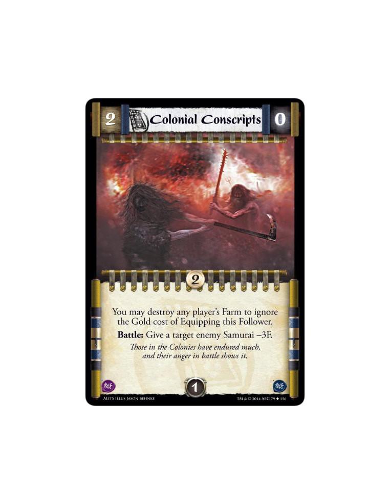 Colonial Conscripts  - You may destroy any player's Farm to ignore the Gold cost of Equipping this Follower.Battle: Give a targe