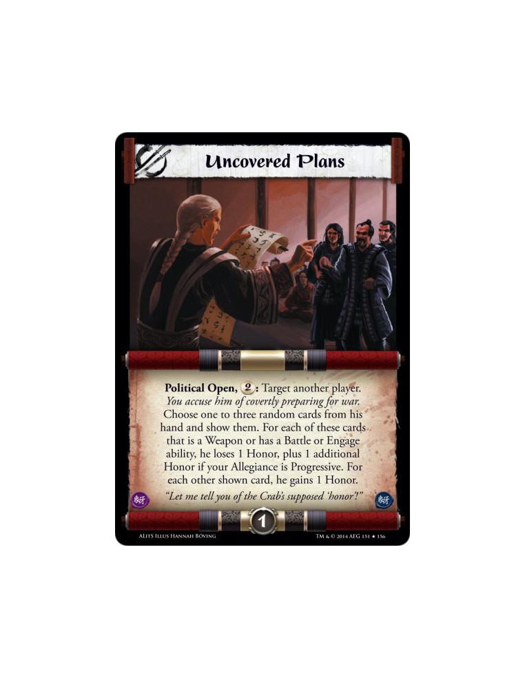 Political Open, 2: Target another player. You accuse him of covertly preparing for war. Choose one to three random cards from his hand and show them. For each of these cards that is a Weapon or has a Battle or Engage ability, he loses 1 Honor, plus 1 additional Honor if your Allegiance is Progressive. For each other shown card, he gains 1 Honor.