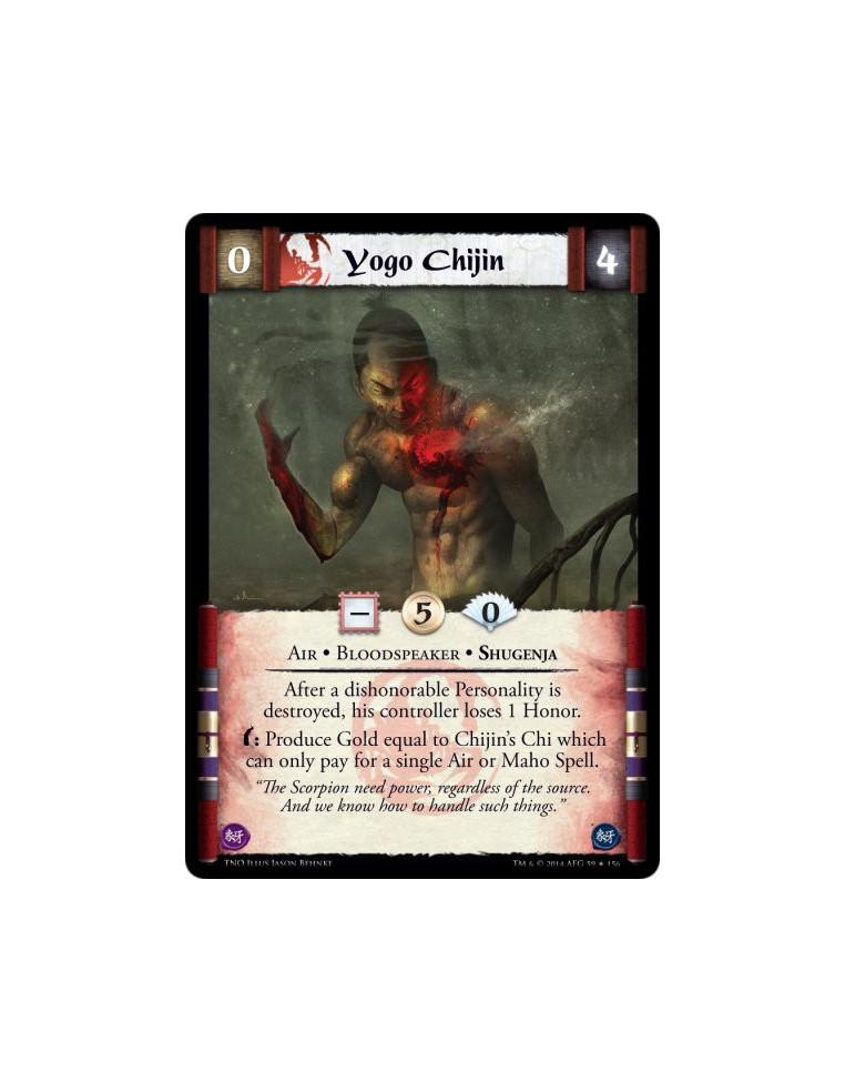 Yogo Chijin  - Air • Bloodspeaker • ShugenjaAfter a dishonorable Personality is destroyed, his controller loses 1 Honor.Bow: Pro