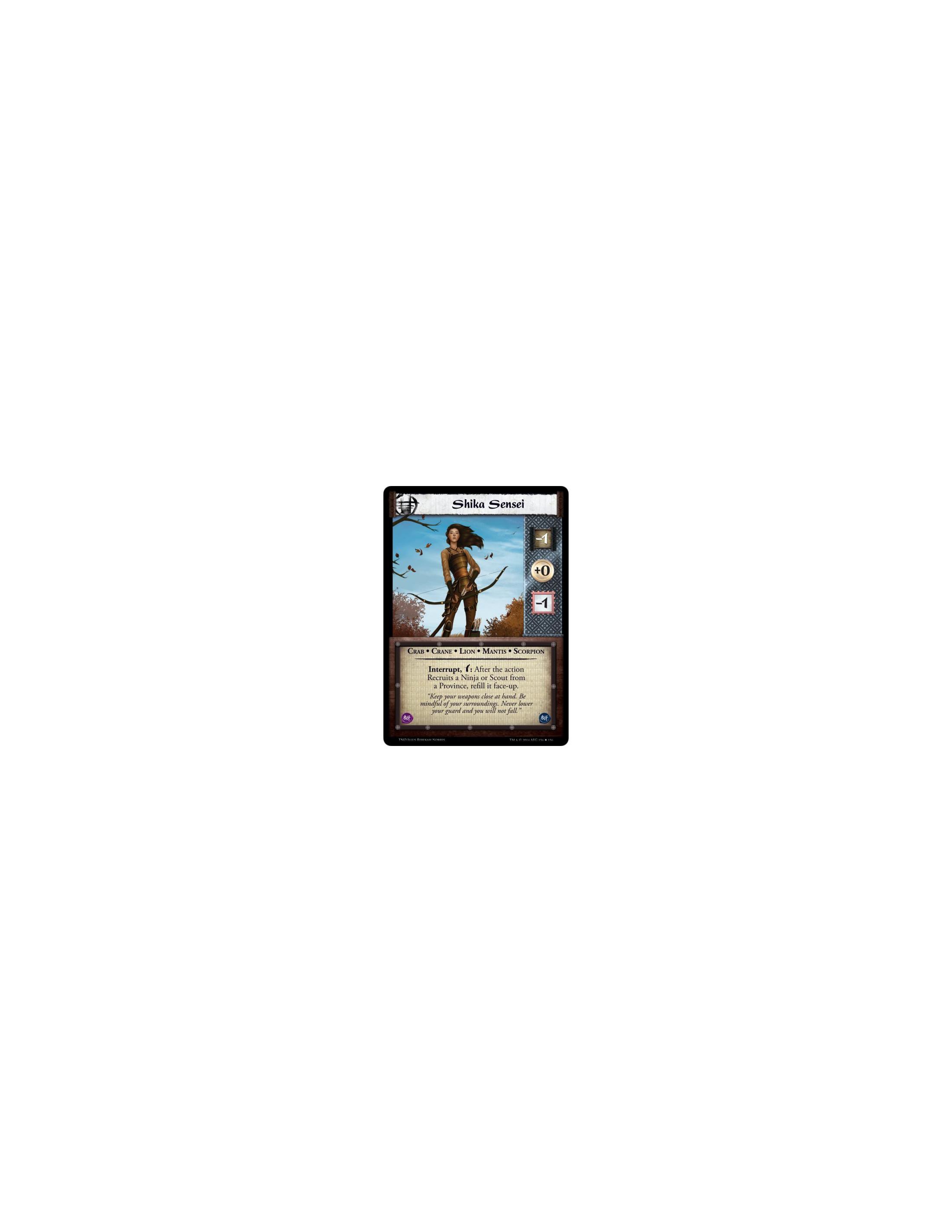 Scorpion Clan Samurai * Ninja Soul of Bayushi Aramoro Limited: Bow Toson to discard a Dynasty card from a Province. (This does not refer to cards attached to a Province. Empty Provinces are refilled immediately.)