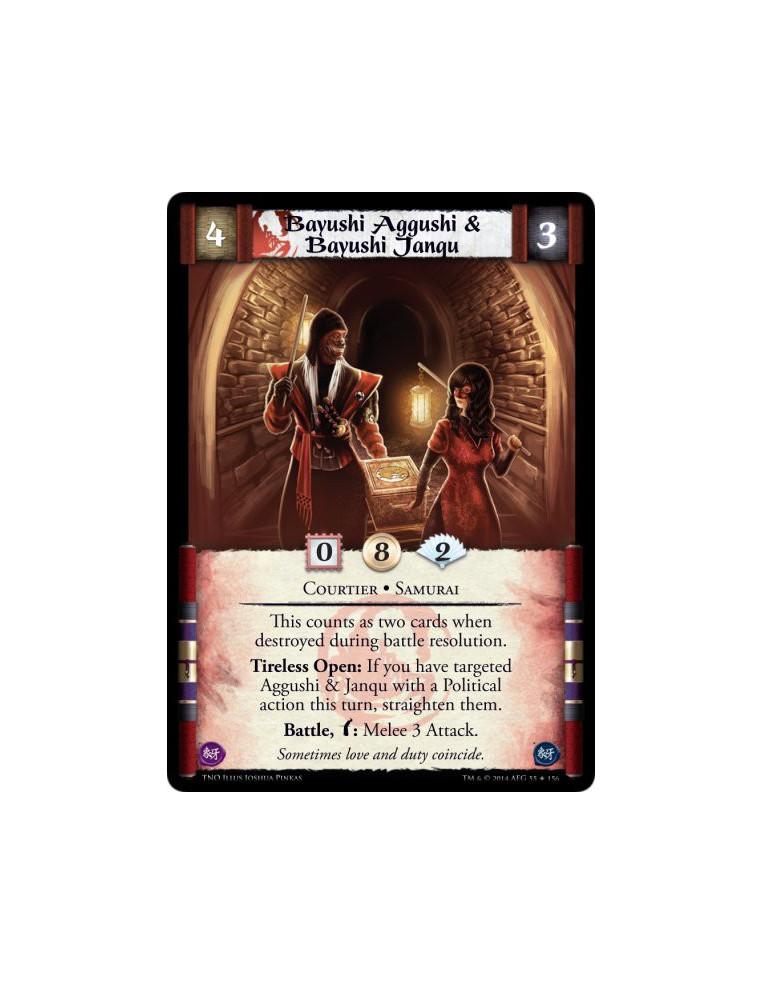 Bayushi Aggushi & Bayushi Janqu FOIL  - Courtier • SamuraiThis counts as two cards when destroyed during battle resolution.Tirel