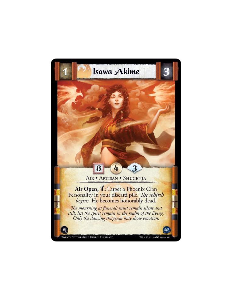 Isawa Akime  - Air • Artisan • ShugenjaAir Open, w: Target a Phoenix Clan Personality in your discard pile. The rebirth begins.