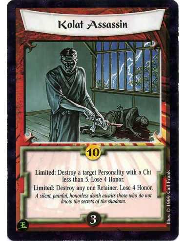 Political Limited: Target one of your Courtiers or Magistrates: After each time this turn another player’s card effect destroys one of your cards, if your card effects have not destroyed any of his cards this turn, he loses 3 Honor and dishonors one of hi