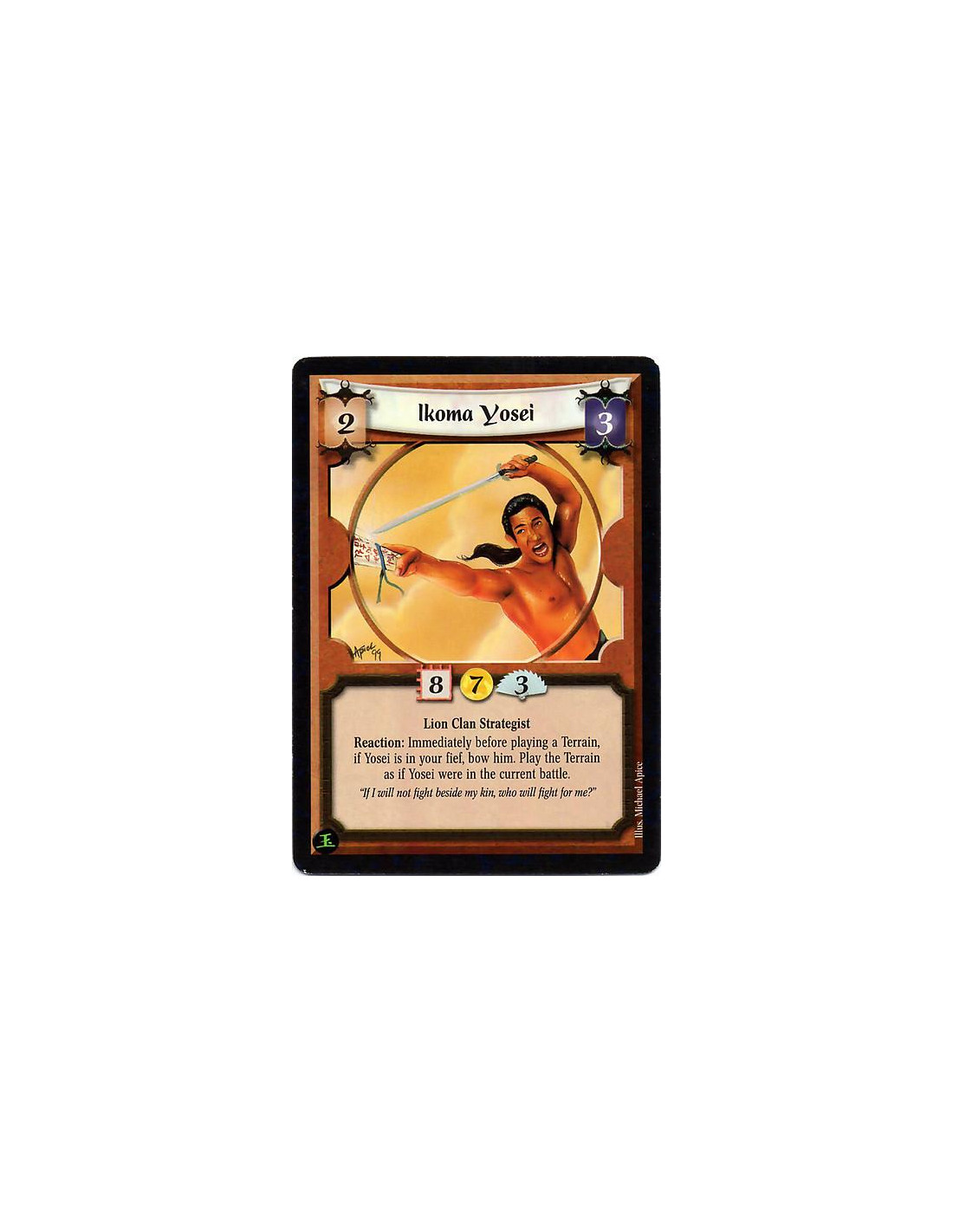 Ikoma Yosei  - Lion Clan Strategist Reaction: Immediately before playing a Terrain, if Yosei is in your fief, bow him. Play the