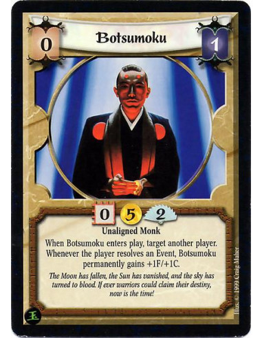 Botsumoku  - Unaligned Monk When Botsumoku enters play, target another player. Whenever the player resolves an Event, Botsumoku