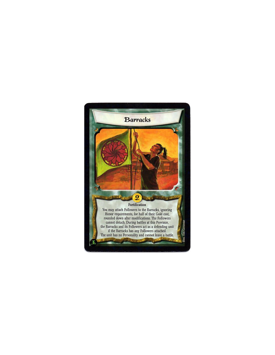 Fortification You may attach Followers to the Barracks, ignoring Honor requirements, for half of their Gold cost, rounded down after modifications. The Followers cannot detach. During battles at this province, the Barracks and its Followers act as a defending unit if the Barracks has any Followers attached. The unit has no Personality and cannot leave a battle.