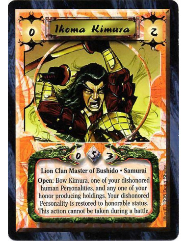 Lion Clan Master of Bushido. Samurai Open: Bow Kimura, one of your dishonored human Personalities, and any one of your honor producing holdings. Your dishonored Personality is restored to honorable status. This action cannot be taken during a battle.