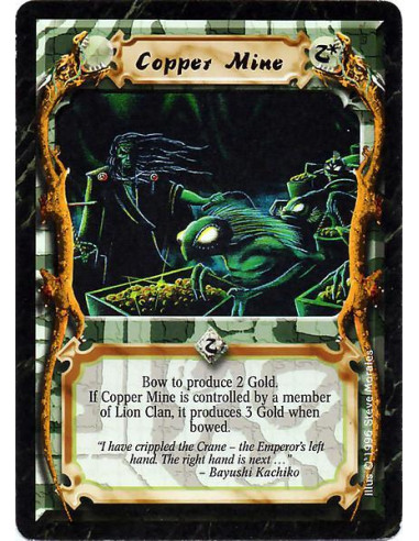 Copper Mine  - Mine. Bow this card: Produce 2 Gold, or 3 Gold if you are a Lion Clan player.
