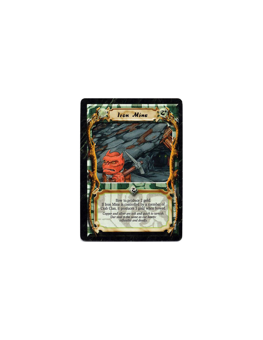 Iron Mine  - Mine. Bow this card: Produce 2 Gold, or 3 Gold if you are a Crab Clan player.