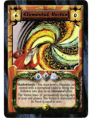 Shadowlands You must bow a Shugenja you control with a corruption token to bring this Follower into play as an Elemental effect. The Vortex loses 1F permanently during each of your end phases. The Vortex is destroyed if its Force is equal to zero. (Errata: Has the Nonhuman trait.)